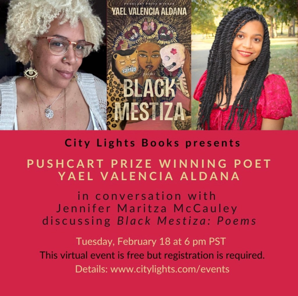 Yael Valencia Aldana in conversation with Jennifer Maritza McCauley in an evening of discussion and poetry reading. City Lights and the University of Kentucky Press celebrate the publication of Black Mestiza: Poems by Yael Valencia AldanaPublished by The University Press of Kentucky